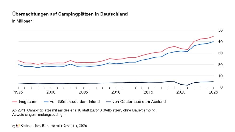 Der Boom beim Camping setzt sich fort und hat im vergangenen Jahr einen neuen Rekord erreicht. Mit fast 44,7 Millionen Gästeübernachtungen im Jahr 2025 haben so viele Menschen wie noch nie auf Campingplätzen in Deutschland übernachtet, wie das Statistische Bundesamt (Destatis) zum Start der Campingsaison mitteilt. Das waren 4,2 % mehr Campingübernachtungen als im Jahr 2024 (42,9 Millionen) und 24,9 % mehr als vor der Pandemie (2019: 35,8 Millionen).